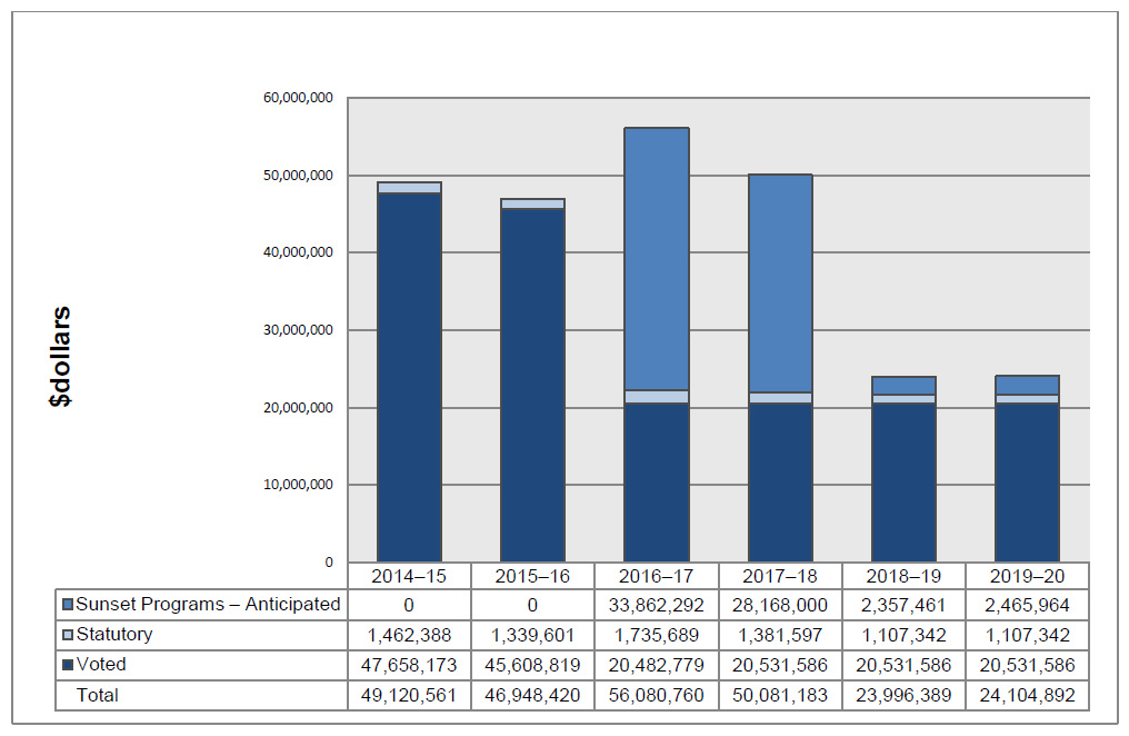 | The difference is mainly due to the sunset of the Northern Adult Basic Education Program ($3.9 million) and the Centre for Northern Innovation in Mining initiative ($1.1 million). The impact of accrual items (capitalization and employee insurance benefits) and other administrative adjustments accounts for the difference. | |||