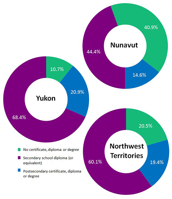 Educational attainment across the territories varies, with close to 70% of the population aged 25-64 in Yukon having attained a postsecondary certificate, diploma or degree, compared with just over 60% in Northwest Territories and just under 45% in Nunavut having attained this level of certificate.