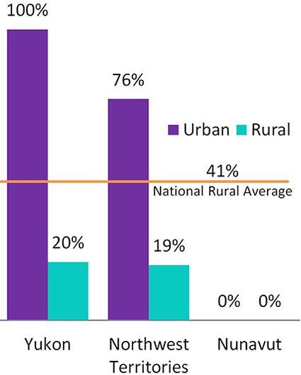 Broadband coverage across the territories varies significantly, falling below the national rural average in rural Yukon and Northwest Territories, and all across Nunavut.