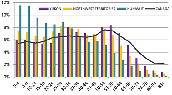 | Age | Yukon (%) | Northwest Territories (%) | Nunavut (%) | Canada (%) |