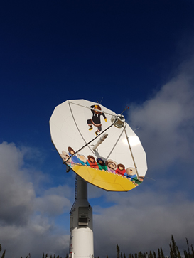 Inuvik has a unique position to track and receive data in real time from polar-orbiting satellites. Pictured above is a Government of Canada satellite used for scientific, mapping, environmental monitoring and other purposes. This satellite has been covered with artwork from Sheree McLeod, to represent the Inuvialuit culture, by showing a blanket toss which was traditionally used to throw someone up in the air to look for caribou or whales. Along with a commercial satellite facility, Inuvik is developing the foundations of an emerging high tech industry.