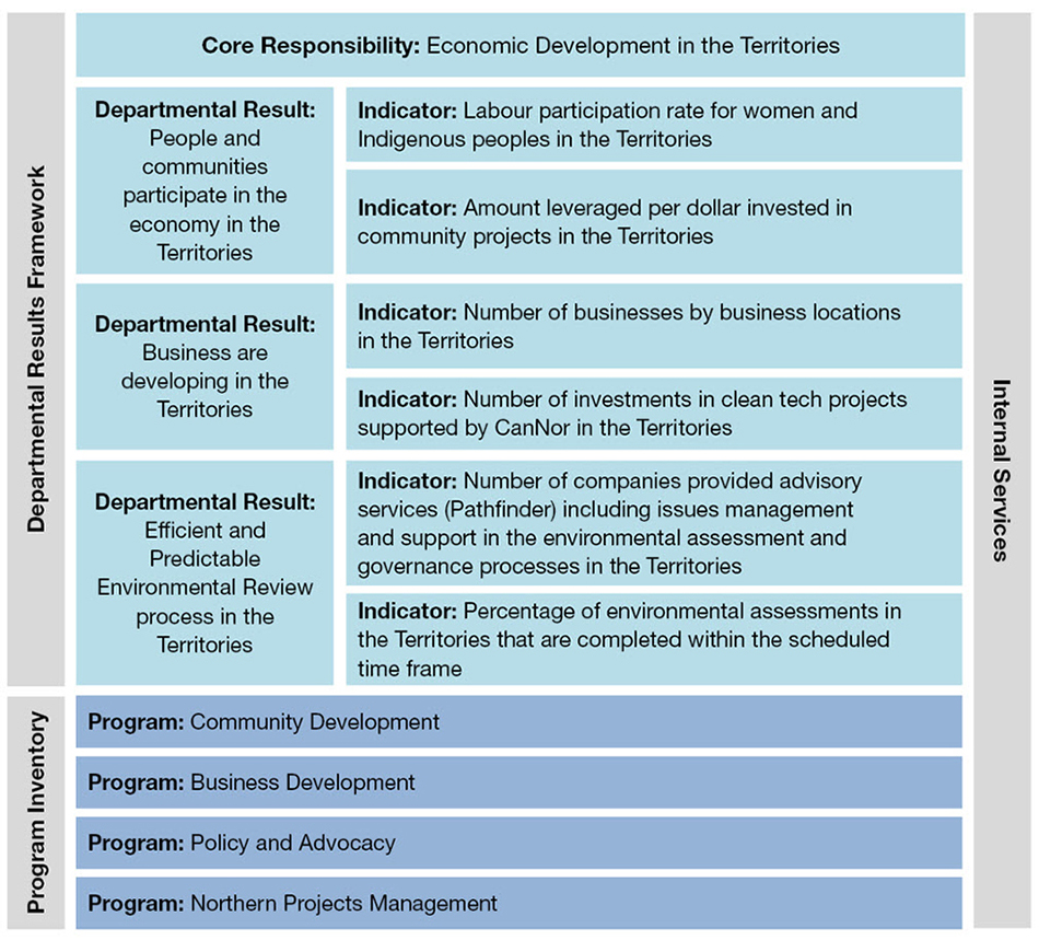 The Canadian Northern Economic Development Agency's Departmental Results Framework and Program Inventory of record for 2020–21 are shown below: